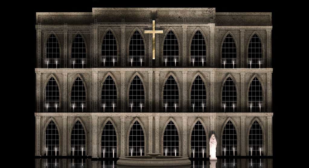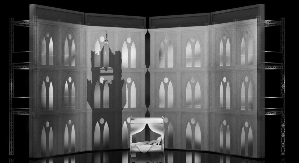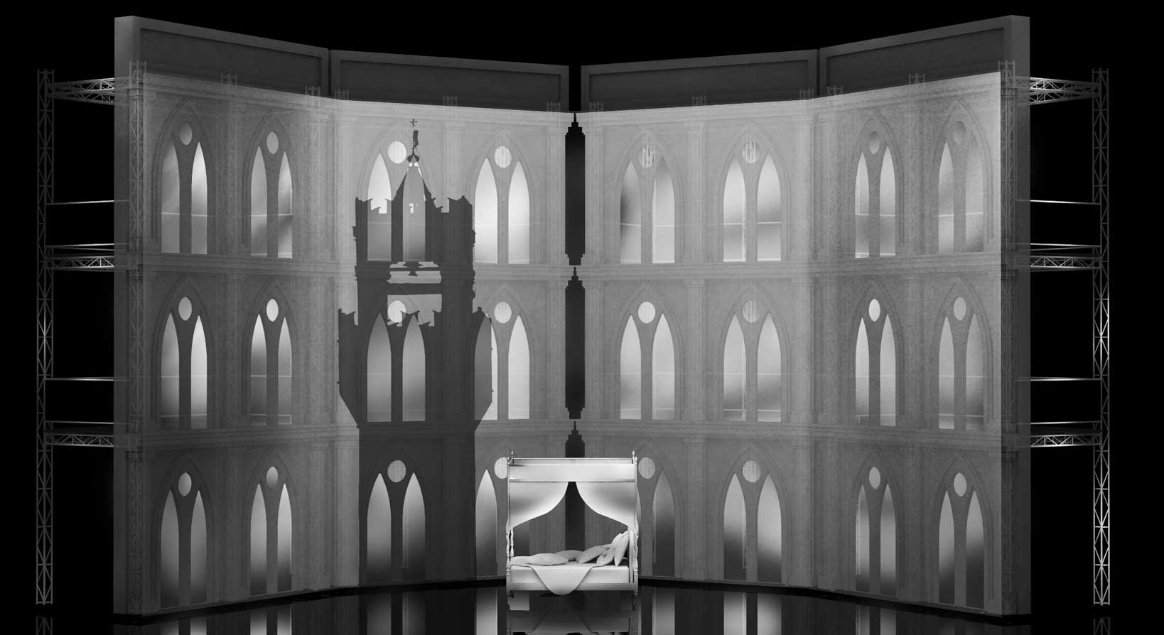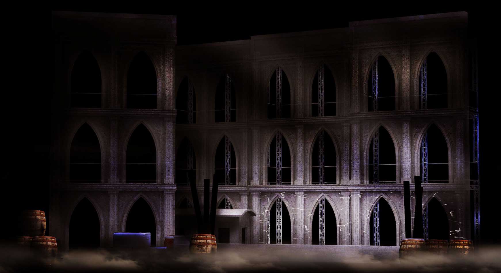 in questo progetto scenografico, queste tre opere condividono lo stesso impianto scenico costituito da impalcature e tessuti, le quali formano tre torri che mosse durante il cambio scena, compungono tre differenti ambientazioni. l’attrezzeria poi, descrive ulteriormente ogni atto. tutto l’impianto è ideato per essere economico e itinerante, e per essere allestito senza difficoltà nella maggior parte dei teatri